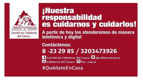 Popayán, marzo 16 de 2020 (Prensa Comité Cauca) En el marco de la emergencia sanitaria decretada por el Gobierno nacional, las directrices decretadas por las Administraciones municipales y con el objetivo de proteger la salud y la vida de nuestras más de 90 mil familias cafeteras, de más de 300 colaboradores y sus familias y de la comunidad en general, la FNC-Comité de Cafeteros del Cauca adopta las siguientes medidas que regirán del 17 al 31 de marzo: